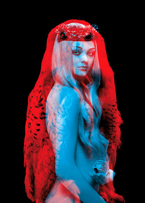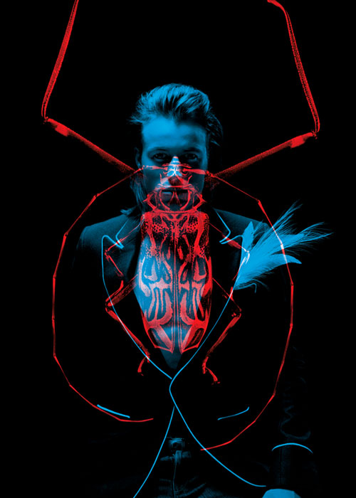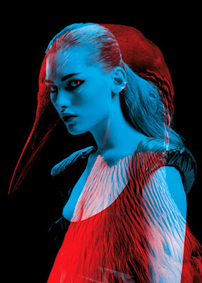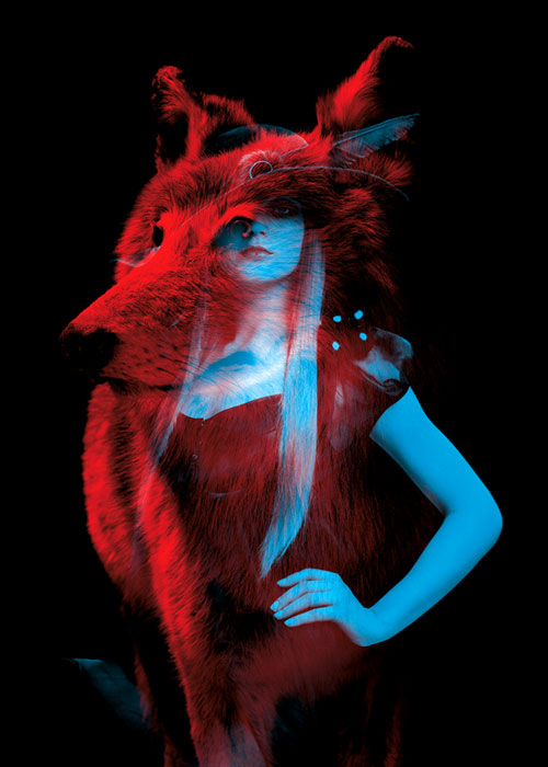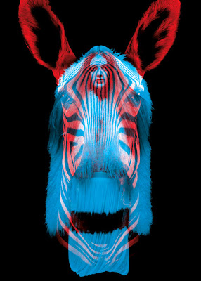 Blaue Modeportrait & rote Tierportrait übereinandergelegt, Galeries Lafayette, Hausmann Strasse. 2006 - Bildformat: 5 x 8 Meter.